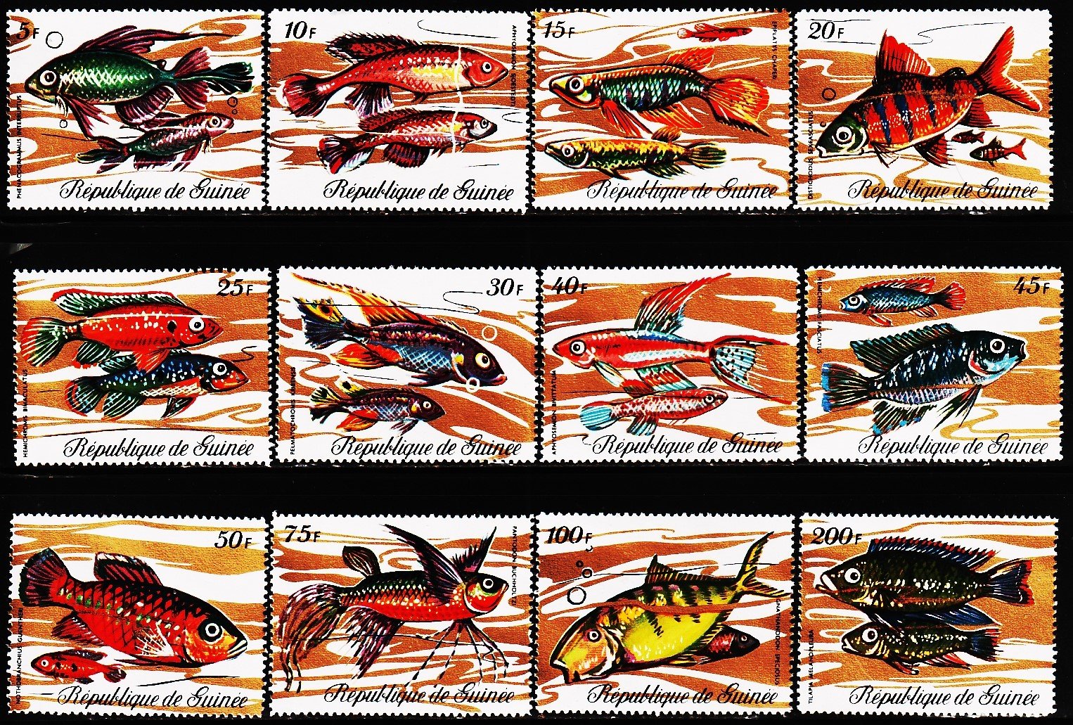 The GUINEA 1971 Fish Stamp Set is a rare and visually striking collectible that makes a perfect addition to any philatelist’s collection. Featuring 12 meticulously designed stamps adorned with golden ink, this set showcases the rich marine diversity of Guinea through elegant artistry. Each stamp in the series highlights a unique aquatic creature, creating an impressive fusion of art and appreciation for nature.